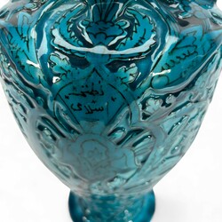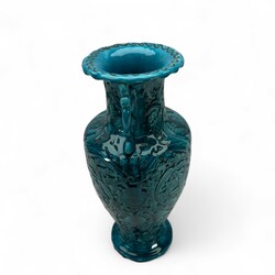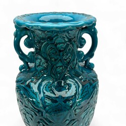 | Omschrijving | Een Perzische porseleinen twee orenvaas, 44 cm hoog. In relief opgehoogde decors van bladeren en voorzien van een blauwe lusterglazuur en Perzisch geschrift. |