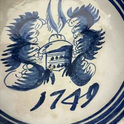 | Omschrijving | Een antieke 18e eeuwse Fries aardewerken wapenschotel, gedateerd 1749. Herkomst: collectie Minze van der Akker (Fries Aardewerk Museum Harlingen). Zie boek p. 78, nr. 0115111 |