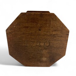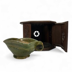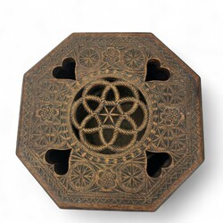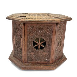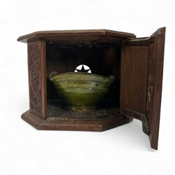 | Omschrijving | Een antieke 19e eeuwse achtkantige Fries kerfsnee aardewerken stoof, aan de bovenzijde met Turkse knoop en vier hartvormige openingen. Aan de onderzijde gestoken '1740'. Met 19e eeuws aardewerken testje. |