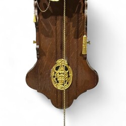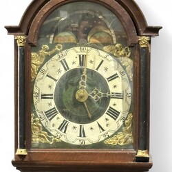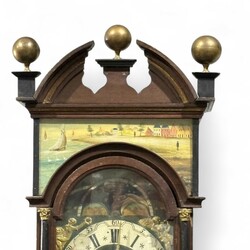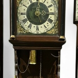 | Omschrijving | Friese staartklok in eiken kast, de dubbele kap bekroond door bolornamenten en met beschilderde landschapsdecors, maanstand in de toog, 19e eeuw |