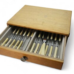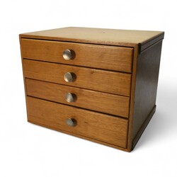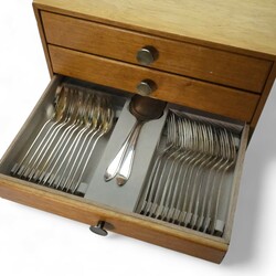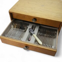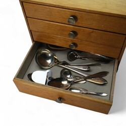 | Omschrijving | Een 20e eeuwse houten bestekcassette. Gero, ca. 1950. Met vijf laden. |