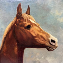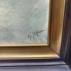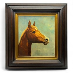 | Omschrijving | Schilderij, olieverf op doek. Paardenhoofd tegen lichtblauwe achtergrond . Linksonder gesigneerd G.J. Adema (Franeker 1898 - Leeuwarden 1981). In brede bruine lijst. |