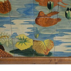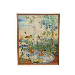 | Omschrijving | Een groot 20e eeuws tegeltableau met decor van kraanvogels, gesigneerd El Rissec, Spanje. |