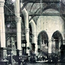 | Omschrijving | Een laat 19e of vroeg 20e eeuws Hollands 20-pas tegeltableau, voorstelling van het interieur van de Grote Kerk te Edam, naar een schilderij van Johannes Bosboom (Den Haag, 1817 – 1891), door plateelbakkerij Rozenburg, Den Haag. In originele eikenhouten profiellijst. Bosboom schilderde de Grote Kerk te Edam in 1858, het werk waarop dit tegelteableau is gebaseerd is onderdeel van de collectie van het Stedelijk Museum in Amsterdam (objectnummer A 2197). |