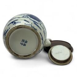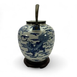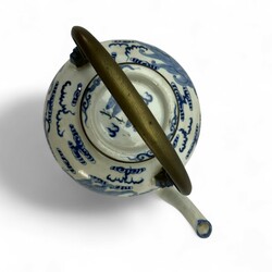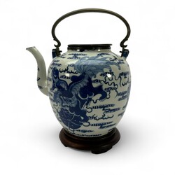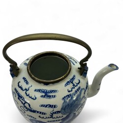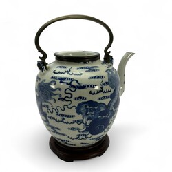 | Omschrijving | Een grote Chinees porseleinen theepot met bronzen handvat, 31 cm hoog x 17 cm doorsnede. Blauw/wit met rondom een decor van vier spelende tempelleeuwen. Ge- merkt met vier karaktertekens. 19e eeuws op antieke houten sokkel. |