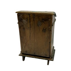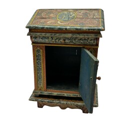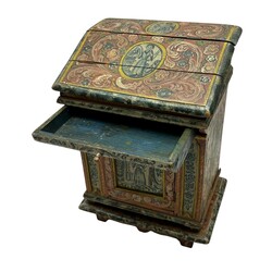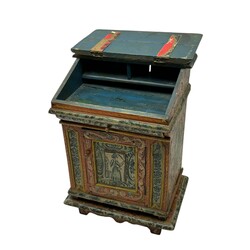 | Omschrijving | Hindelooper beschilderd houten miniatuur lessenaar, rijkelijk beschilderd met blauw-witte figuren in cartouches, waaromheen florale motieven, verder met klep, lade en deurtje, het geheel staand op bijhorend onderstel, Friesland, 18e eeuw |