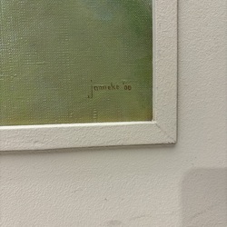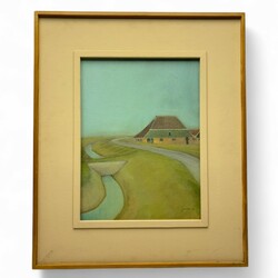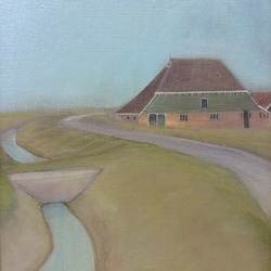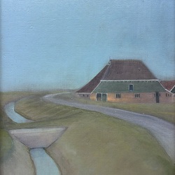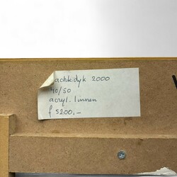 | Omschrijving | Schilderij, acryl op doek. Voorstelling van een boerderij langs een weg en sloot, verso titel 'De Slachtedyk'. Rechtsonder gesigneerd Janneke Hengst (Bolsward, 1956), gedateerd 2000. |