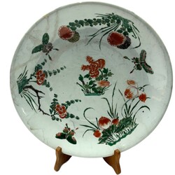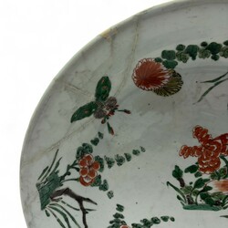 | Omschrijving | Een antieke 18e eeuwse Famille verte schotel, Kangxi periode (1661-1722), met decor van vlinders en bloemen. |