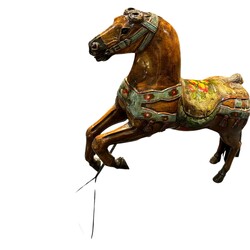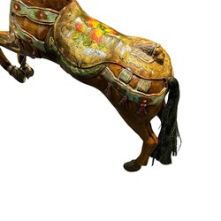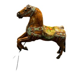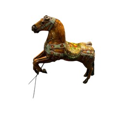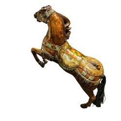 | Omschrijving | Een 20e eeuws gepolychromeerd houten kermispaard, steigerend, op zwarte metalen steun. |