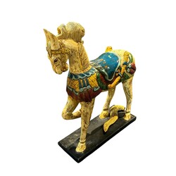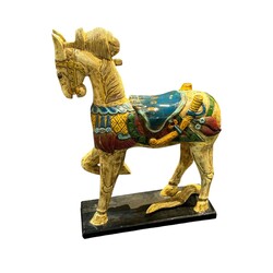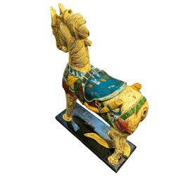 | Omschrijving | Een 20e eeuws gepolychromeerd houten kermispaard, in dressuur, op zwart houten basement. |