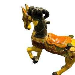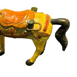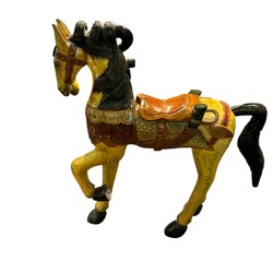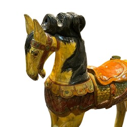 | Omschrijving | Een groot 20e eeuws gepolychromeerd houten kermispaard |