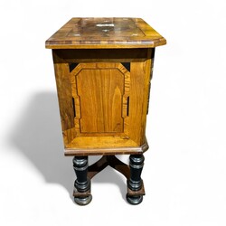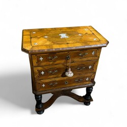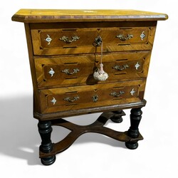 | Omschrijving | Een antiek 18e of 19e eeuwse notenhouten gefineerd en ingelegd kastje met drie lades, met bronzen beslag. Op bolpoten, met kruisvoet. Vermoedelijk Italiaans |
