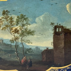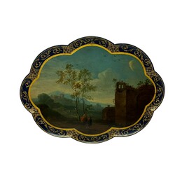 | Omschrijving | Lakwerk dienblad met romantische olieverf beschildering van figuren bij een vervallen ruïne, de geschulpte rand gedecoreerd met servetwerk en krulvormen in goudverf op blauw, 18e eeuws, vermoedelijk Duitsland of Nederland. |
