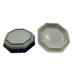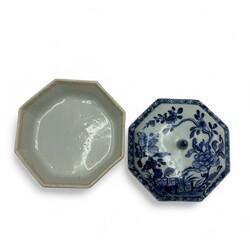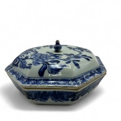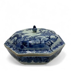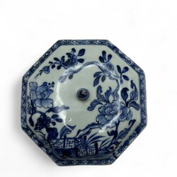 | Omschrijving | Een Chinees Qianlong porseleinen achtkantige deskelschaal. Blauw/wit met op de deksel een vpoprstellinmg van een Oosterse tuin met hekwerk en pioenroos en op de rand servetwerk. |
