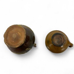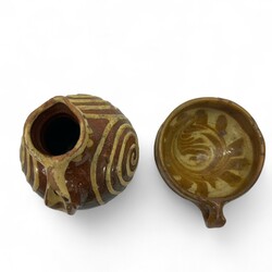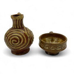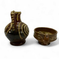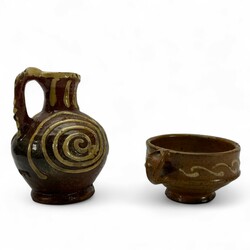 | Omschrijving | Een antieke 17e eeuwse aardewerken schenkkan en papkom, beide met slibdecor. |