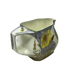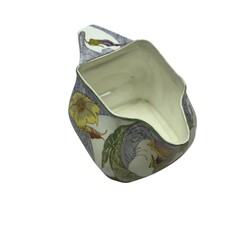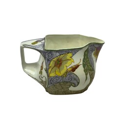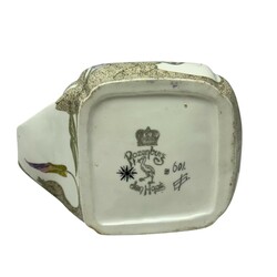 | Omschrijving | Een eierschaal porseleinen melkkan met florale beschildering. Aan de onderzijde gemerkt Rozenburg Den Haag, schildersmonogram Samuel Schellink. Tevens gemerkt met zonnetje = 1902 en werkordernummer 601. |