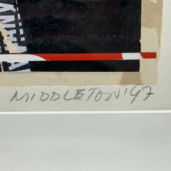| Omschrijving | Kleurenzeefdruk op papier, abstracte compositie, titel 'Composition I'. Rechtsonder gesigneerd Sam Middleton (New York 1927 - Schagen 2015), gedateerd 1997. Oplage 11/100. |