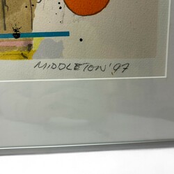 | Omschrijving | Kleurenzeefdruk op papier, abstracte compositie, titel 'Midnight Sun'. Rechtsonder gesigneerd Sam Middleton (New York 1927 - Schagen 2015), gedateerd 1997. Oplage 12/100. |