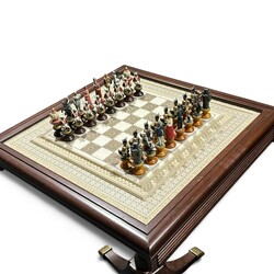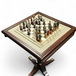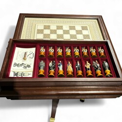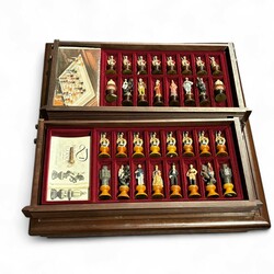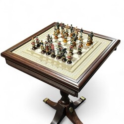 | Omschrijving | Een 20e eeuws schaakspel op tafel, de belegering van Lucknow (De Indiase Sepoy revolutie) uitgave Franklin Mint, ca. 1980. Compleet met alle stukken |