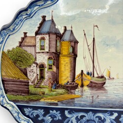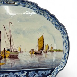 | Omschrijving | Een grote antieke plaquette, Tichelaar Makkum. Polychroom gedcor met voorstelling van schepen op een rivier. Aan de achterzijde gemerkt. |