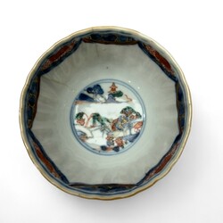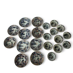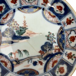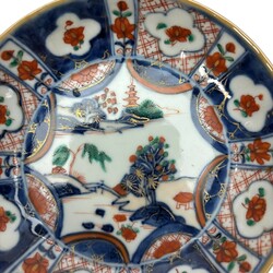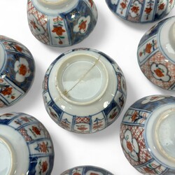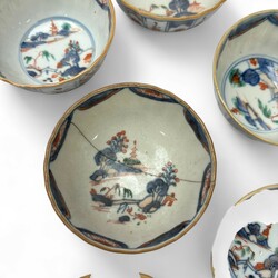 | Omschrijving | Tien Qianlong Chinees Imari porseleinen kop en schotels. Met florale decors in vlakverdelingen op de rand en een Oosterse landschap op het plat. |