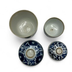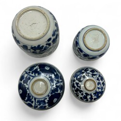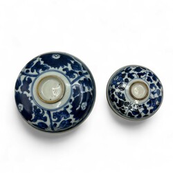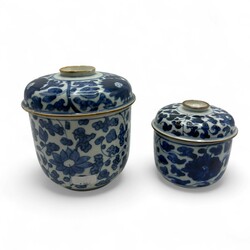 | Omschrijving | Twee Chinees porseleinen KangXi periode Kandij deskelpotten. Blauw/wit met rondom lotusbloemen decors. |