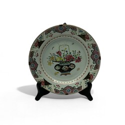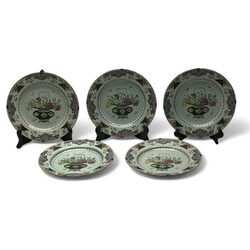 | Omschrijving | Een set van vijf 18e eeuwse Famille rose schotels, Yongzheng periode (1722-1735) met decor van pioenrozen op de randen en een bloemenmand op het plat. |