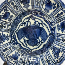 | Omschrijving | Een Chinees porseleinen Wanli periode zgn kraak schotel. Blauw/wit met op de randen cartouches mer florale motieven en op het plat diverse kostbaarheden. |