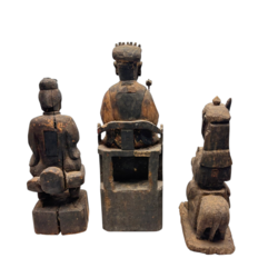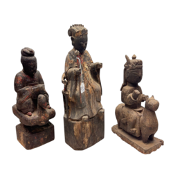 | Omschrijving | Lot van drie antieke 19e eeuwse houten sculpturen, Yao cultuur, Thailand. Gedeeltelijk gepolychromeerd, Eén met voorstelling van een figuur met staf zittend op stoel, twee figuren zittend op een dier. Twee grootste sculpturen met luikje aan de achterzijde, één met Chinese tekens (vertaald ‘Hier de houtsnijders naam is Chou Fah, de figuur representeert de 8ste God van het Yao panteon: Fang Tien Tah Wang, gemaakt voor de Chiao Foo Chai familie in het 11de jaar van keiser Tung Che van de Ching dynasty’. |