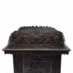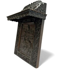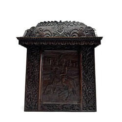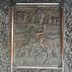 | Omschrijving | Een antiek (gedeeltelijk) 17e eeuws Engels gestoken wandpaneel. Centraal reliëf van een ruiter voor een stadsmuur, omlijst door rijk blad- en bloemmotief. Bovenaan voorzien van een wapenschild met monogram en het jaartal 1661. Mogelijk onderdeel van een meubelstuk. |