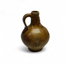 | Omschrijving | Een antieke Duitse baardmankruik met oor. Versierd met zoutglazuur en drie medaillons van een zon met gezichtje. Vermoedelijk Frechen, 17e eeuw. |