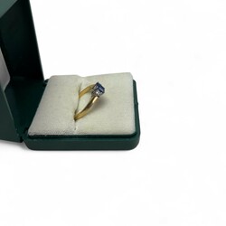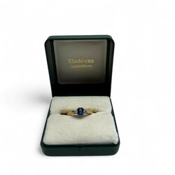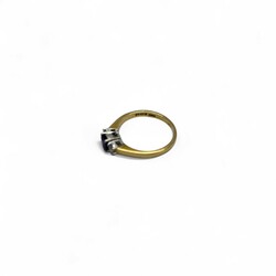 | Omschrijving | Een 18 karaats (750/1000) geelgouden ring, bezet met achthoekige saffier en twee briljant geslepen diamanten. Totaal diamant ca. 0,15 karaat |