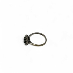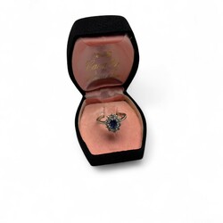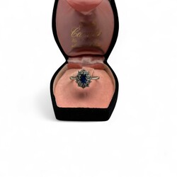 | Omschrijving | Een 20e eeuwse 18 karaats (750/1000) witgouden entouragering, centraal bezet met ovale saffier, rondom met briljant geslepen diamantjes. |