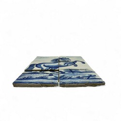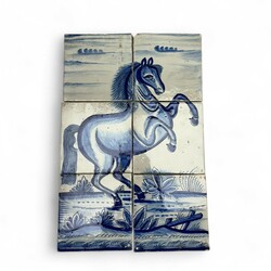 | Omschrijving | Een antiek 18e eeuws Fries zespas tegeltableau, blauw-wit voorstelling van een steigerend paard. |
