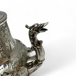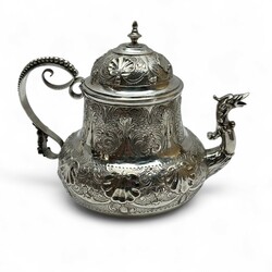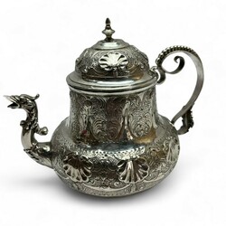 | Omschrijving | Een antiek vroeg 18e eeuws Fries zilveren theepot. Balustervormig model, gedreven en gegraveerd, onder andere met schelpmotieven. Aan de onderzijde gemerkt HS = vermoedelijk Hermannus Scherphuis of Hendrik Jan Spanjer, Groningen. Tevens gegraveerd met initialen ‘AW’ en ‘AIH’. |