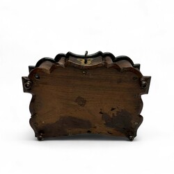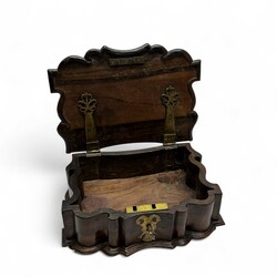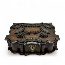 | Omschrijving | Een antiek 18e eeuws koloniaal coromandel houten documentenkistje. Orgelgebogen, met gecontourneerde randen en gestoken floraal decor, twee messing scharnieren en messing slotplaat met dubbelkoppige adelaar. Geplaatst op vier bolpootjes. |