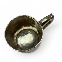 | Omschrijving | Een antieke 18e eeuwse zilveren bierpul met hengsel. Vermoedelijk Engels, aan de onderzijde gemerkt ‘LR’ |