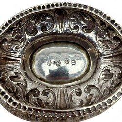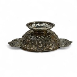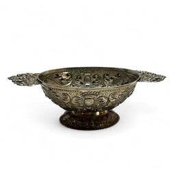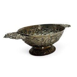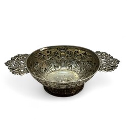 | Omschrijving | Een antieke vroeg 18e eeuwse Fries zilveren brandewijnkom. Ovaal model, gedreven en gegraveerd, gegoten grepen met voorstelling van engelen en bloemenmand. Aan de onderzijde gemerkt met meesterteken ‘IE’ = Johannes Ennema (1697), werkzaam te Franeker vanaf 1725, jaarletter P (1730). Tevens gegraveerd met familiewapen (halve adelaar en twee scheppen) en initialen ‘J.P. J.T.’ en datering 1730. |