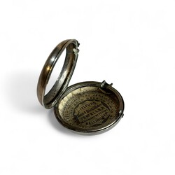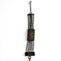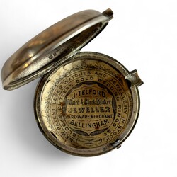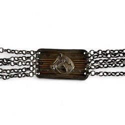 | Omschrijving | Een antiek 19e eeuws Engels eerste gehalte (925/1000) zilveren zakhorloge. Emaille wijzerplaat met Romeinse cijferaanduiding en secondeaanduiding. In dubbele zilveren kast, gemerkt voor Birmingham, jaarletter A (1875), zilversmid , meesterteken JK (vermoedelijk Jeremiah Kirk, The Butts, Coventry), uurwerk gemerkt ‘Geo Gibson Dunse’. Aan een Nederlandse 19e eeuwse tweede gehalte (835/1000) zilveren chatelaine met vijfrijig jasseroncollier en plaatje met afbeelding van paardenhoofd, gekeurd met lopende leeuw. |