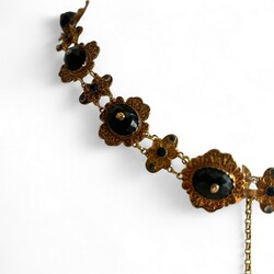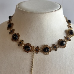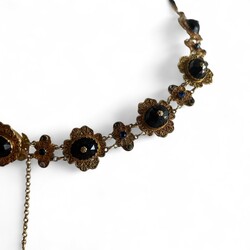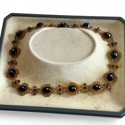 | Omschrijving | Een antiek 19e eeuws 14 karaats (585/1000) geelgouden bootjescollier. Filigrain bewerkte rand, schakels bezet met gefacetteerde granaat, tevens met rotskristal en blauwe glassteen. Gemerkt met oud eikenblaadje op de sluiting. |