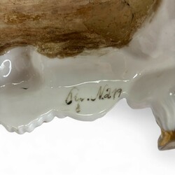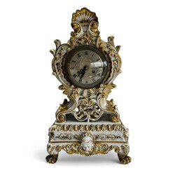 | Omschrijving | Een antieke 19e eeuwse pendule van verguld en gepolychromeerd porselein, 19e eeuw, met rijk acanthus- en schelpmotief en cartouche met Romeinse cijfers |