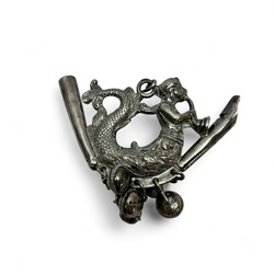 | Omschrijving | Een antieke 19e eeuwse tweede gehalte (835/1000) zilveren rammelaar of rinkelbel met fluitje, het geheel in de vorm van een zeemeermin met hoorn, aan de onderzijde met vijf zilveren belletjes. Op het oogje gekeurd ‘TR26’ = Tjeerd Reekers, werkzaam te Workum van 1864 tot 1916 |