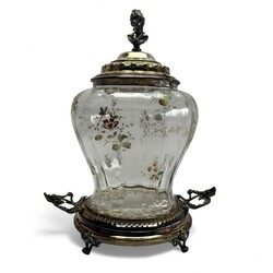 | Omschrijving | Een antieke 19e eeuwse glazen bowlpot, met emaille beschildering van bloemen, vruchten en vlinders, met verzilverde deksel en onderschotel, bekroond met buste. Neorenaissance stijl, ca. 1880 |