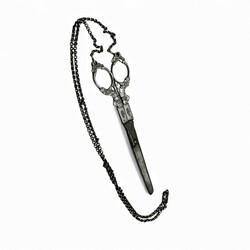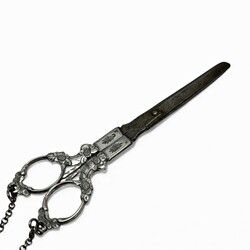 | Omschrijving | Een antieke 19e eeuwse tweede gehalte (835/1000) zilveren naaischaar aan jasseroncollier, mr. Abraham Jurjens Westers, werkzaam te Nieuwe Pekela van 1815 tot 1842. Met daarbij een speldenkussen in tweede gehalte (835/1000) zilveren montuur, met voorstelling van boerin met juk aan weerszijden. Gekeurd met zwaardje en onduidelijk meesterteken op het oogje. |