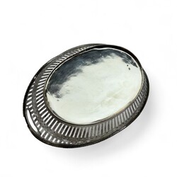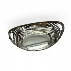 | Omschrijving | Een 20e eeuwse tweede gehalte (835/1000) zilveren broodmand. Schuitvormig model, ajour gezaagd, met twee grepen, aan de boven- en onderzijde versierd met parelrand. Gekeurd met minervakopje, lopende leeuw, jaarletter L (1921) en meesterteken VKB in ruit = Kempen, Begeer en Vos, Nederlandse Edelmetaalbedrijven, periode 1920 tot 1931. |