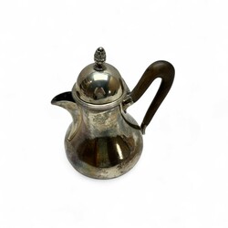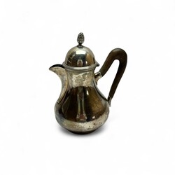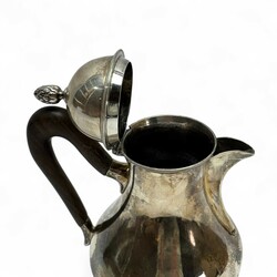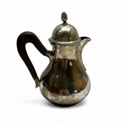 | Omschrijving | Een vroeg 19e eeuwse eerste gehalte (925/1000) zilveren koffiepot met coromandelhouten oor, model ‘Turkse muts’. Deksel met geribde rand, bektroond met een pijnappel. Op de buik gegraveerd met initialen onder kroon, vermoedelijk Engels 19e eeuw. Aan de onderzijde gemerkt met staande leeuw, stadskeur Amsterdam, jaarletter Y (1807) en meesterteken ‘drie appels in schild’ = Johannes Logerath, werkzaam te Amsterdam vanaf 1772. |