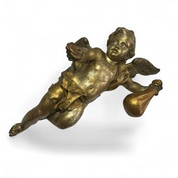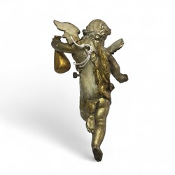 | Omschrijving | Een antieke 19e eeuwse uit hout gestoken en vergulde engel, altaarstuk. Met uitgestrekte vleugels, in de linkerhand een zak, in de rechterhand munten. |