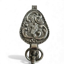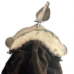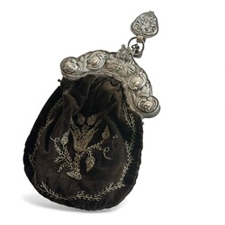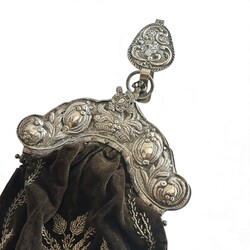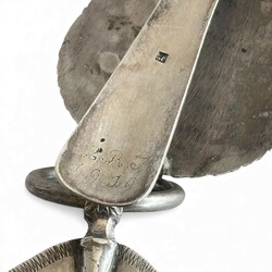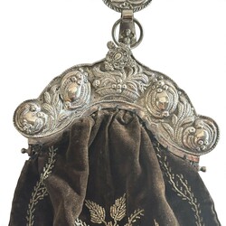 | Omschrijving | Een antieke 19e eeuwse tas aan tweede gehalte (835/1000) zilveren tasbeugel en rokhaak, met voorstelling van De Hoop (met kruis). Gedreven en gegraveerde voorzijde. Aan de achterzijde gekeurd met minervakopje en meesterteken J2 = Fa. Gebr. Jonker, werkzaam te Meppel van 1890 tot 1924, jaarletter M (1896). Tevens met stippelgravure ‘B.A.C. 1898’ (op de tas) en ‘N.R.J. 1919’ (op de haak). |