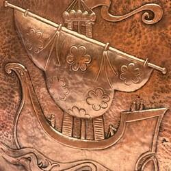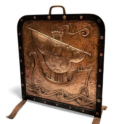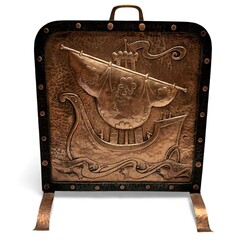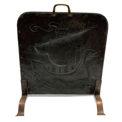 | Omschrijving | Een vroeg 20e eeuws smeedijzeren en roodkoperen haardscherm, voorstelling van een (viking)schip met figuren en vissen. Aan de achterzijde gesigneerd JP = John Pearson (1859-1930), gedateerd 1905. |