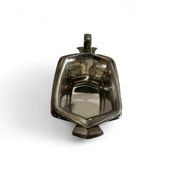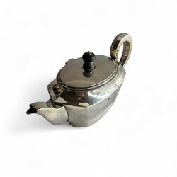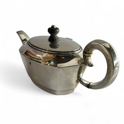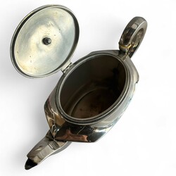 | Omschrijving | Een 20e eeuws Duits driedelig jaren ‘30 art deco tweede gehalte (835/1000) zilveren theeeservies, bestaande uit melkkan, suikerpot en theepot. Gemerkt met importkeur ‘V’ (buitenlandse werken 1906-1953), ‘830’ maan & kroon,, tevens meesterteken Wilkens & Sohne, Bremen. |